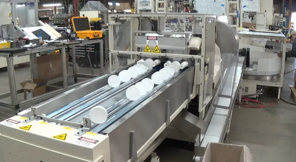 Muller lid systems can handle most round lids on the market today. They allow for stacking of lids where manual and punch stacking are just not capable of creating nested stacks. Downstream capabilities go all the way from manual packing to fully automated case packing and palletizing. Standard systems handle lids from 3” up to 6.5” diameters, and rates 400ppm per bowl/lane.